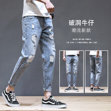 拼富鹿 夏季新品破洞直筒牛仔裤男士宽松九分男夏季时尚修身牛仔裤束脚休闲小脚裤子男薄款潮牌 K819蓝灰 28(推荐体重90-105斤)