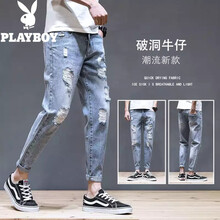 花花公子破洞牛仔裤男夏季薄款直筒宽松潮牌韩版百搭大码阔腿直脚裤男生青少年潮流休闲男装弹力长裤子男装 K819蓝灰色 请选尺码