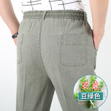 【2条118】中老年男装夏季亚麻裤男宽松休闲裤男士薄款透气老人裤子爸爸高腰直筒裤父亲长裤松紧腰棉麻裤 豆绿色 侧面无兜款 5XL体重180-200斤【适合...