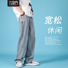 九型门 牛仔裤男宽松直筒拖地长裤夏季韩版帅气男裤子青少年ins潮流百搭休闲阔腿老爹裤 浅蓝 M
