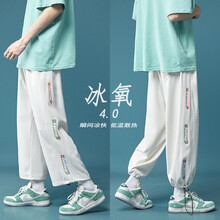 鲁宾克 冰丝休闲裤男士裤子港风青少年学生运动哈伦裤夏季薄款韩版潮流宽松垂感直筒阔腿裤抽绳九分运动束脚 白色 XL