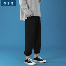型男港 夏天韩版冰丝速干休闲裤男垂感九分裤男宽松束脚直筒阔腿百搭9分裤子男 黑色 L