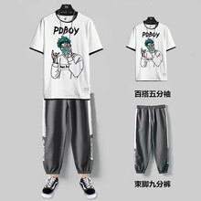 上衣+裤子59】两件套套装男学生衣服休闲裤男宽松潮流港风直筒裤子男夏季薄款九分束脚工装裤男冰丝裤短袖 上衣(白色)+休闲裤(灰色) XXS30斤