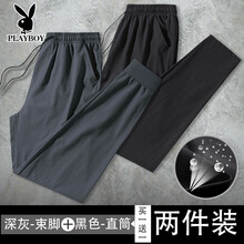 【两件装】花花公子休闲裤男夏季薄款冰丝速干透气弹力九分裤子男士宽松大码直筒束脚韩版潮流运动跑步训练裤 黑色直筒+深灰束脚 XL