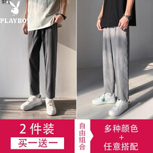 花花公子【冰丝裤两件套】休闲裤男2021夏季新款薄款潮流清凉透气速干直筒小西裤男士吸湿九分下装男裤子 纯色深灰+条纹灰 L
