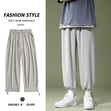 潮至 裤子男夏季薄款冰丝休闲裤男港风ins潮牌垂感清凉透气宽松抽绳运动束脚裤潮流百搭学生哈伦九分裤 浅灰色 XL