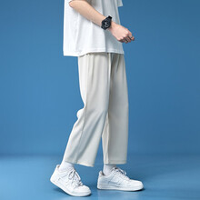 鲁宾克 裤子男2021夏季新款潮牌ins坠感冰丝休闲裤男韩版潮流直筒阔腿裤宽松百搭学生清凉透气九分裤 杏色 L