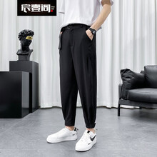 宸壹阁 裤子男夏季新品薄款冰丝港风直筒休闲裤潮流青年垂感宽松哈伦大码小西裤阔腿运动九分裤男 黑色 5XL