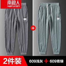南极人轻奢高档男装2021年新款夏季薄款亚麻棉麻运动卫裤男士束脚宽松冰丝速干九分休闲裤子男裤男 浅灰+青绿 XL
