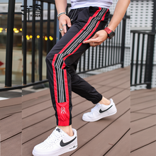 洋客 香港潮牌2021夏季新款欧洲站冰丝印花条纹运动裤个性潮流束脚修身休闲裤男 黑色 M 28-29