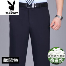 花花公子品牌专柜高档桑蚕丝休闲男裤2021夏季薄款中年西裤男士高腰宽松直筒西装裤子抗皱亲肤易打理 藏蓝色Z春夏薄款桑蚕丝 40码(3尺腰围)