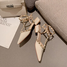 单鞋女2021春季夏新款铆钉尖头中跟百搭网红柳丁平底粗跟鞋子 米白色 35