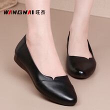 旺奈春秋女士皮鞋真皮软底浅口单鞋平底妈妈鞋圆头中年女鞋子牛皮平跟职业上班工作鞋防滑软皮大码新款 黑色 43