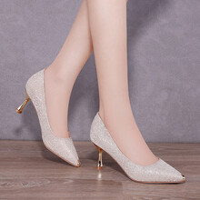 细跟单鞋女尖头浅口女士高跟鞋2021春秋季新款通勤职业工作鞋子女 7137 金色(跟高6.5cm) 36