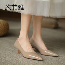 施菲雅欧美羊皮尖头细跟单鞋女2021春秋新款漆皮中跟浅口鞋气质优雅四季猫跟上班职场宴会女鞋 裸色 37