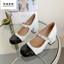裃迪芙特 2021春夏新款一字魔术贴珍珠链条单鞋气质玛丽珍复古粗跟jk小皮鞋 白色链条款 36