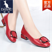 袋鼠(DaiShu)2021春季方头单鞋女眞皮粗跟软底豆豆鞋平底中年女鞋浅口女式皮鞋 红色 34