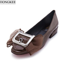 HONGKEE/红科2019年秋季新款甜美蝴蝶结方头平跟漆皮女单鞋HA89X302 丹麦棕 37