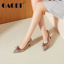 高蒂网面单鞋女夏款透气尖头浅口细高跟鞋百搭蝴蝶结舒适通勤风女鞋 杏色 36