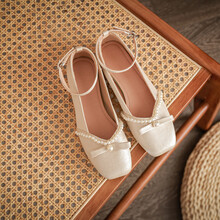 裃迪芙特 2021年夏季新款玛丽珍鞋复古法式方头平底百搭珍珠蝴蝶结浅口单鞋 尚云 香槟色 36