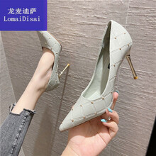 高档轻奢热卖品牌名媛少女高跟鞋设计感气质细跟尖头铆钉菱格浅口感单鞋2021年气质透气女鞋 绿色10cm 34