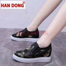 HANDONG 网纱镂空透气休闲单鞋女2021夏季新款厚底蕾丝内增高百搭松糕鞋子 黑色 36