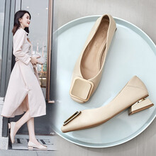 珂米路单鞋女牛皮2021春季新款女鞋方头浅口显瘦瓢鞋透气平底轻便开车豆豆鞋女 杏色 38