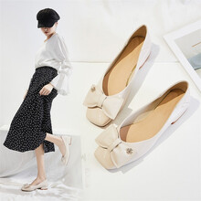 艾斯臣2021春新款女鞋单鞋方头粗低跟一脚蹬浅口奶奶鞋小皮鞋蝴蝶结 米色 39