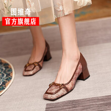 图维奇轻奢品牌2021粗跟单鞋女夏季新款方头浅口女鞋时尚复古马衔扣高跟鞋女士百搭镂空透气网面乐福鞋 棕色 37