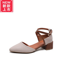 【夏季品质女鞋】 小头凉鞋一字扣带凉鞋女ins潮尖头粗跟高跟鞋仙女风中跟单鞋 棕色 34