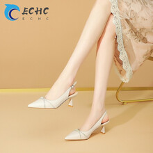 ECHC品牌 尖头高跟鞋女2021年夏季新款水钻时尚百搭细跟后空包头凉鞋女 米白色 34