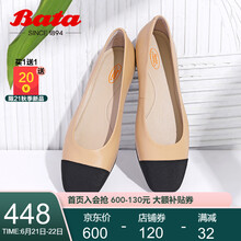 Bata奶奶鞋女2021春商场新款百搭真羊皮平软底浅口单鞋AKN09AQ1纯色粗跟休闲 杏色 36