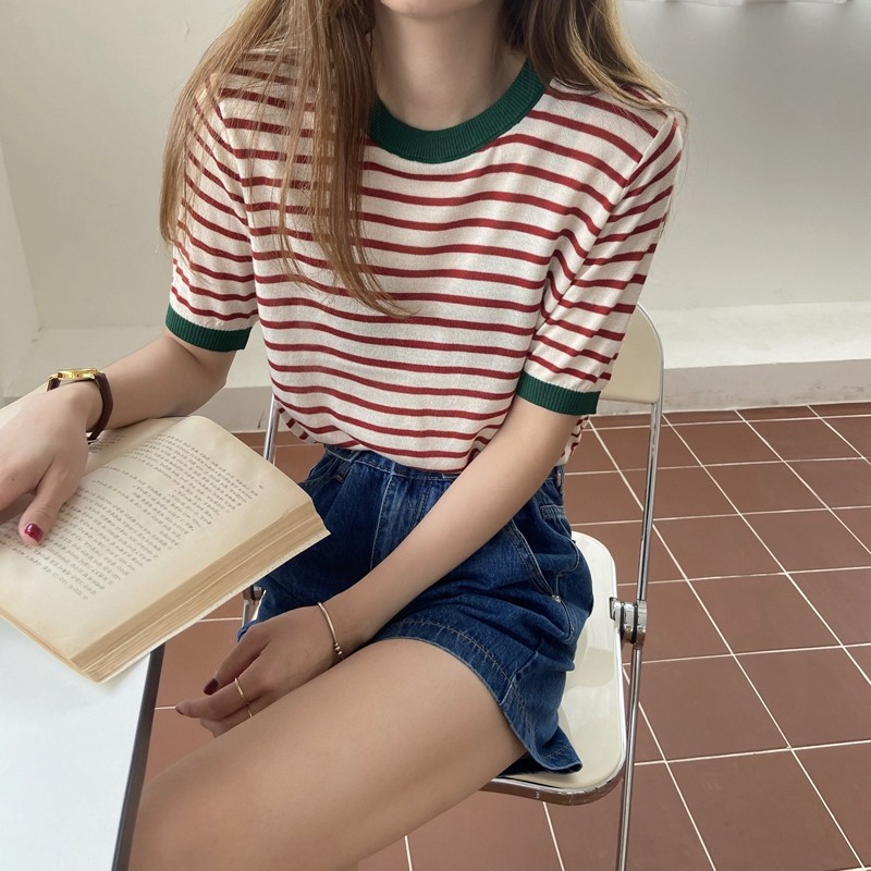 实拍实价 韩版复古ins风条纹设计感短袖针织衫