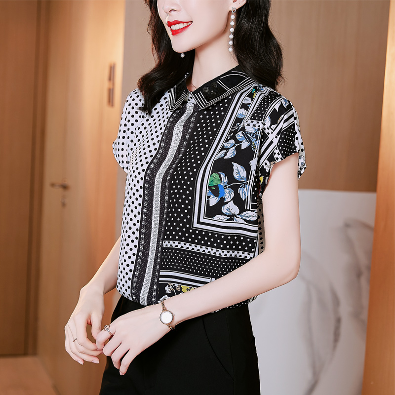 复古波点真丝衬衫2021新款夏季女装拼接方领宽松上衣印花短袖衬衫