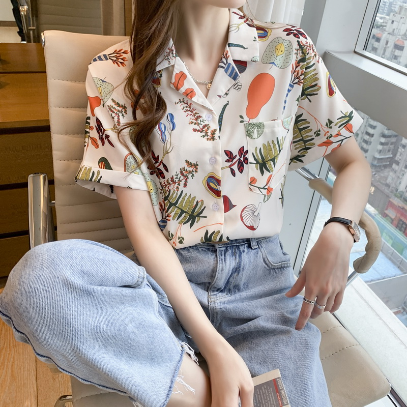 春款2021年新款时尚法式上衣设计感小众短袖衬衣碎花雪纺衬衫女夏