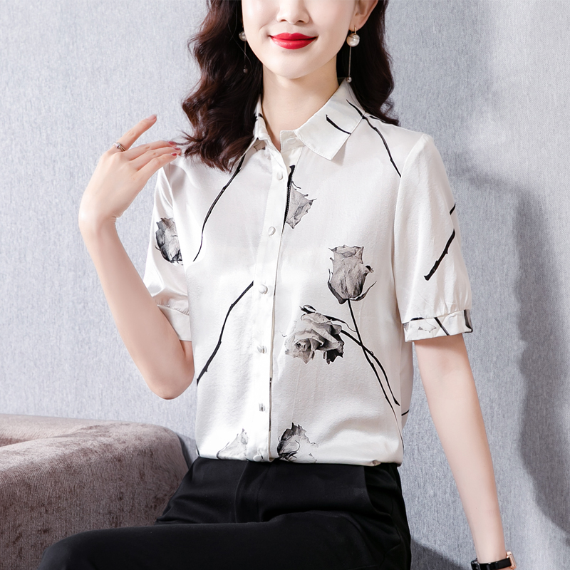 实拍2021夏女士短袖桑蚕丝印花时尚洋气显瘦大码上衣重磅真丝衬衫