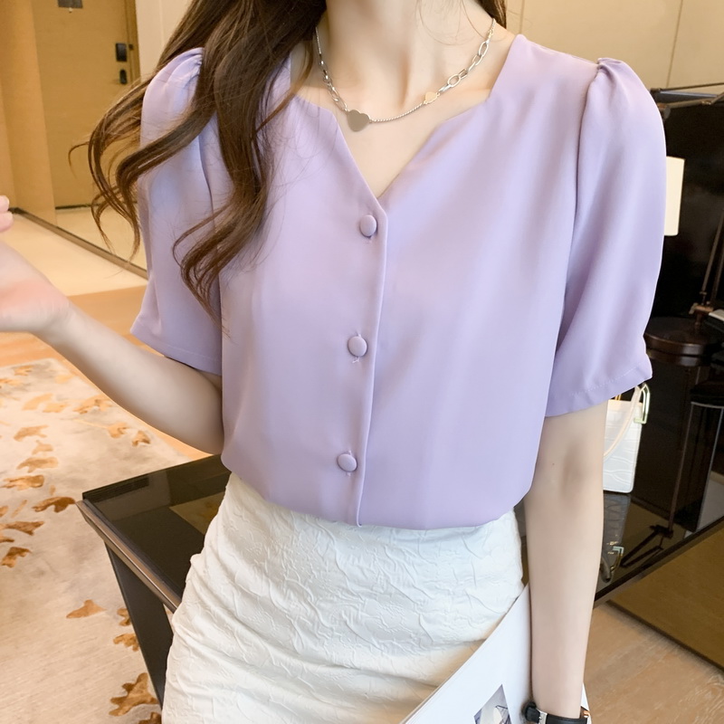 实拍现货2021法式方领雪纺衬衫女设计感小众夏季复古泡泡袖上衣