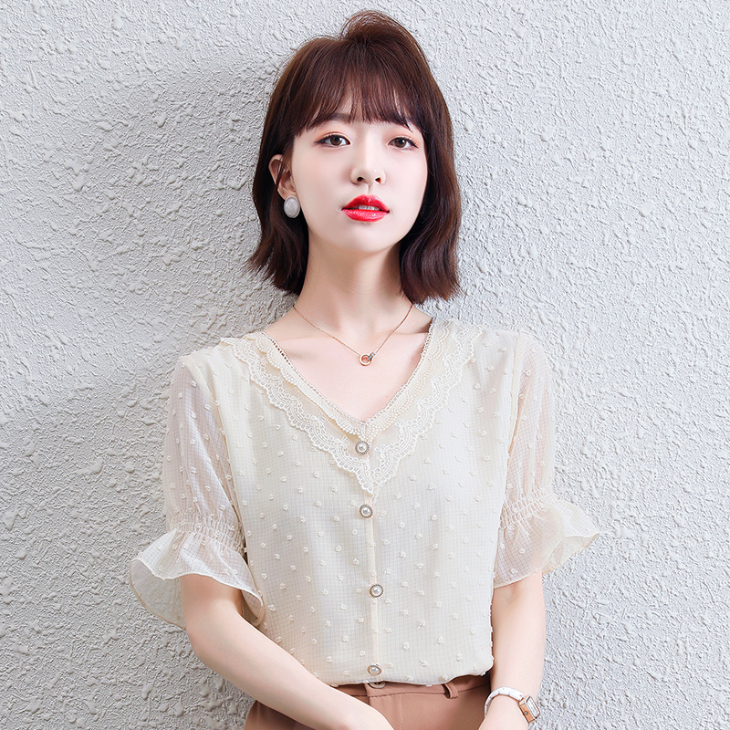 夏季雪纺衫女短袖2021年新款夏装v领气质洋气小衫显瘦遮肚子上衣
