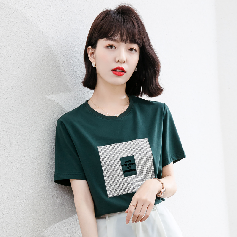 现货绿色短袖t恤女2021年新款夏半袖宽松设计感小众打底衫棉上衣