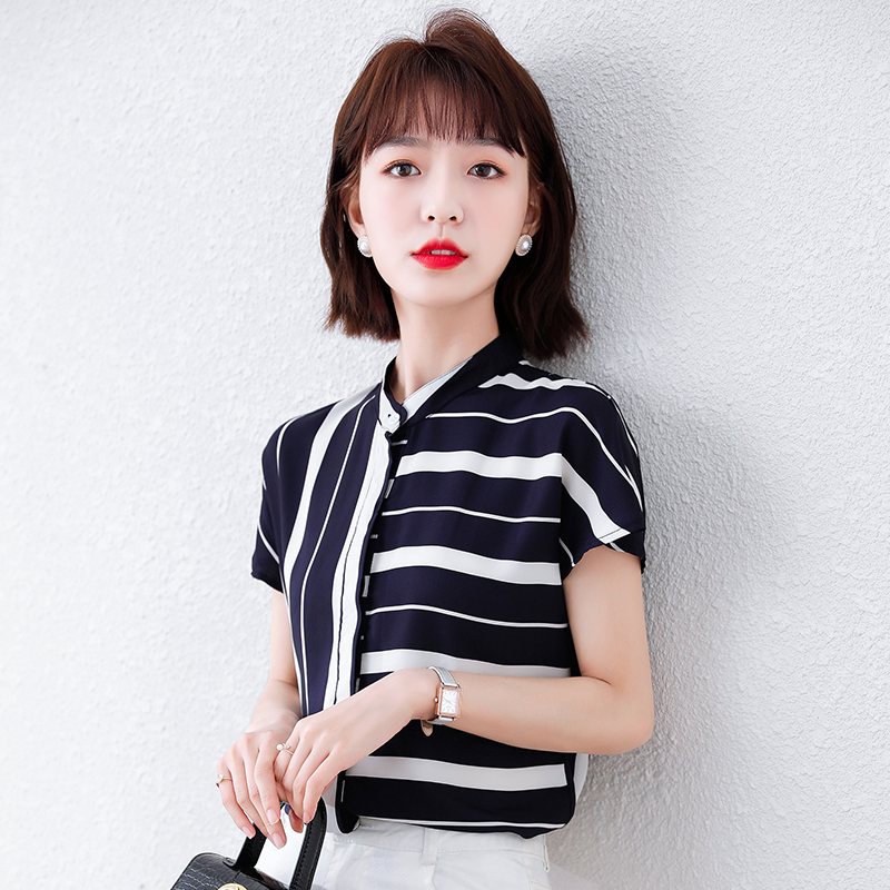 欧货不规则条纹雪纺短袖衬衫女2021春夏新款气质立领短袖显瘦上衣