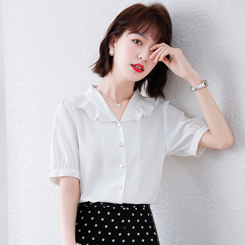 2021年夏装新款法式短袖白衬衫女设计感小众夏别致上衣v领衬衣