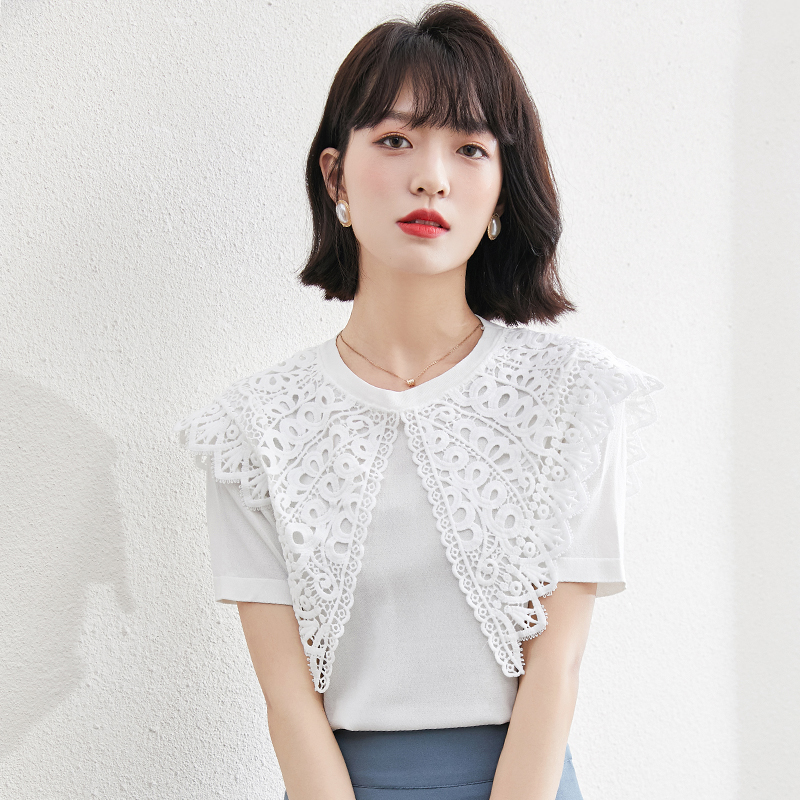 蕾丝花边拼接纯棉短袖t恤女夏装圆领2021韩版宽松设计感上衣