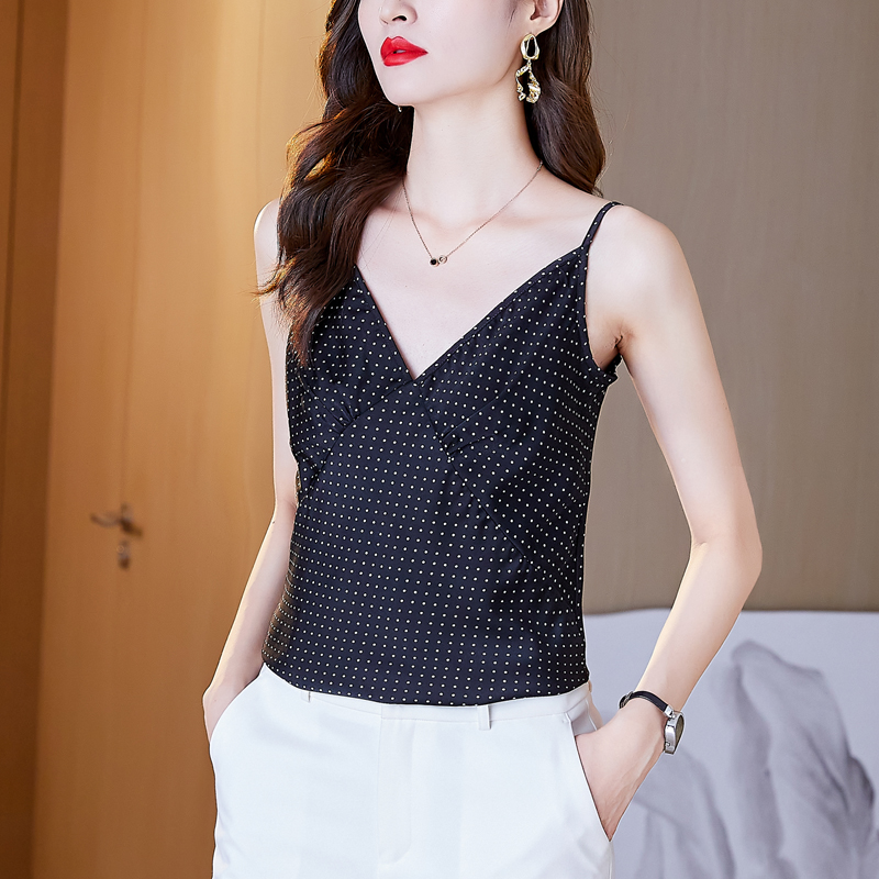 2021实拍真丝吊带背心女夏法式复古波点印花宽松V领西装内搭打底