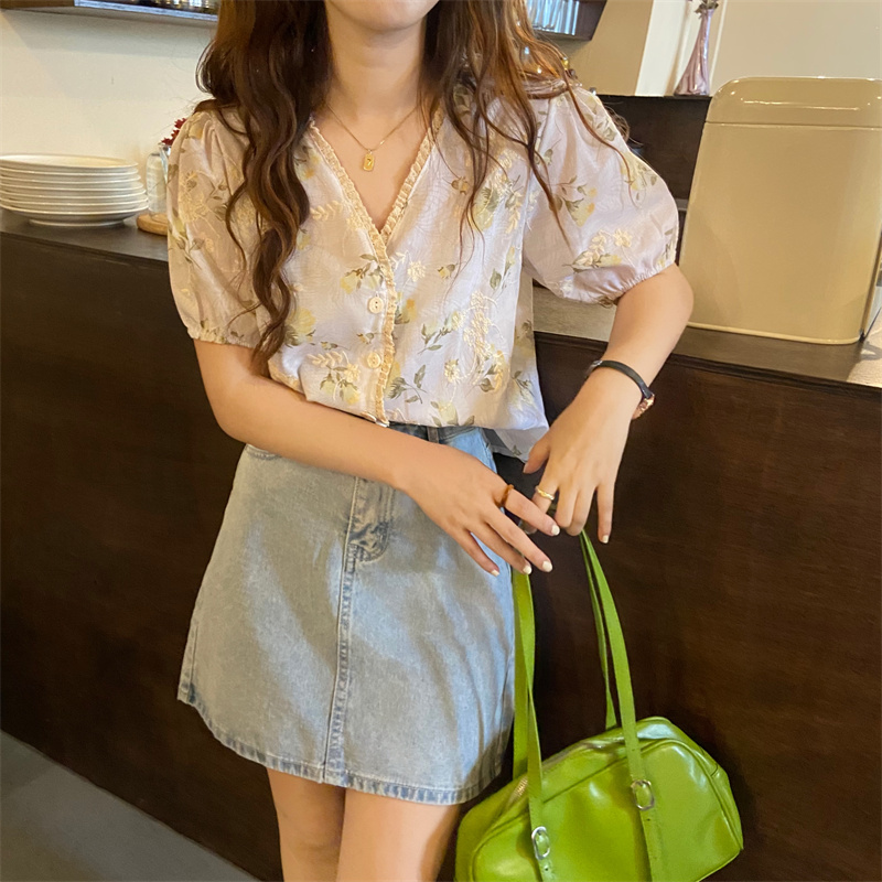 实拍实价 甜美洋气碎花拼接刺绣泡泡袖衬衫女上衣