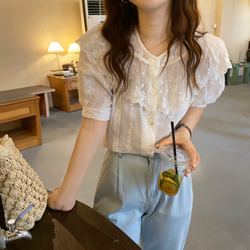 实拍实价 新款韩范圆领拼接蕾丝上衣女小众重工法式衬衫女