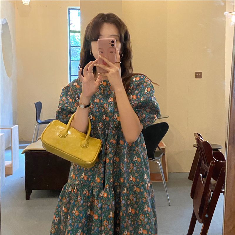 实拍实价 新款韩版甜美绿色碎花裙女泡泡袖宽松连衣裙
