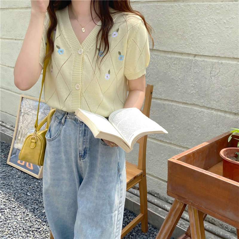 实拍实价 新款夏季马卡龙色系刺绣短款开衫针织短袖上衣女