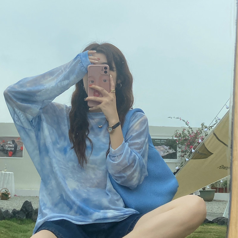 实拍实价 新款韩版小众宽松扎染透视防晒衫洋气长袖T恤女
