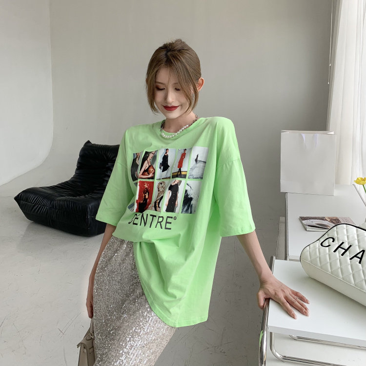实拍实价胶片INS飒美风时尚百搭圆领字母美女图案宽松短袖T恤