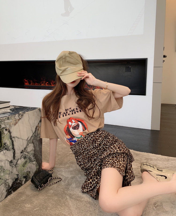 实拍实价~韩版卡通印花T恤+高腰显瘦遮胯豹纹半身裙